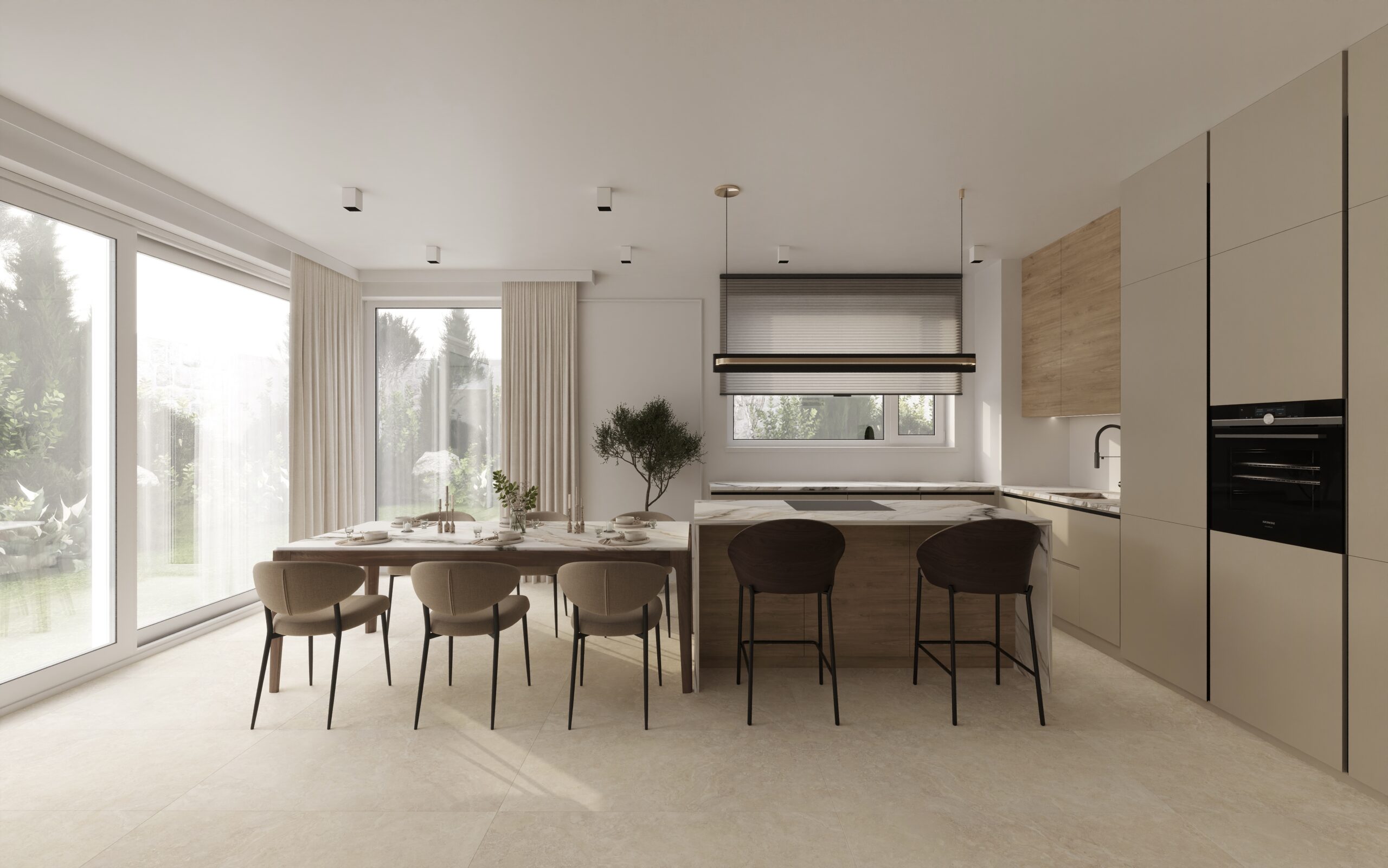 - Sprzęt AGD Siemens: płyta indukcyjna z wbudowanym okapem, piekarnik z funkcją mikrofali, zmywarka — wszystko dyskretnie wkomponowane w zabudowę.