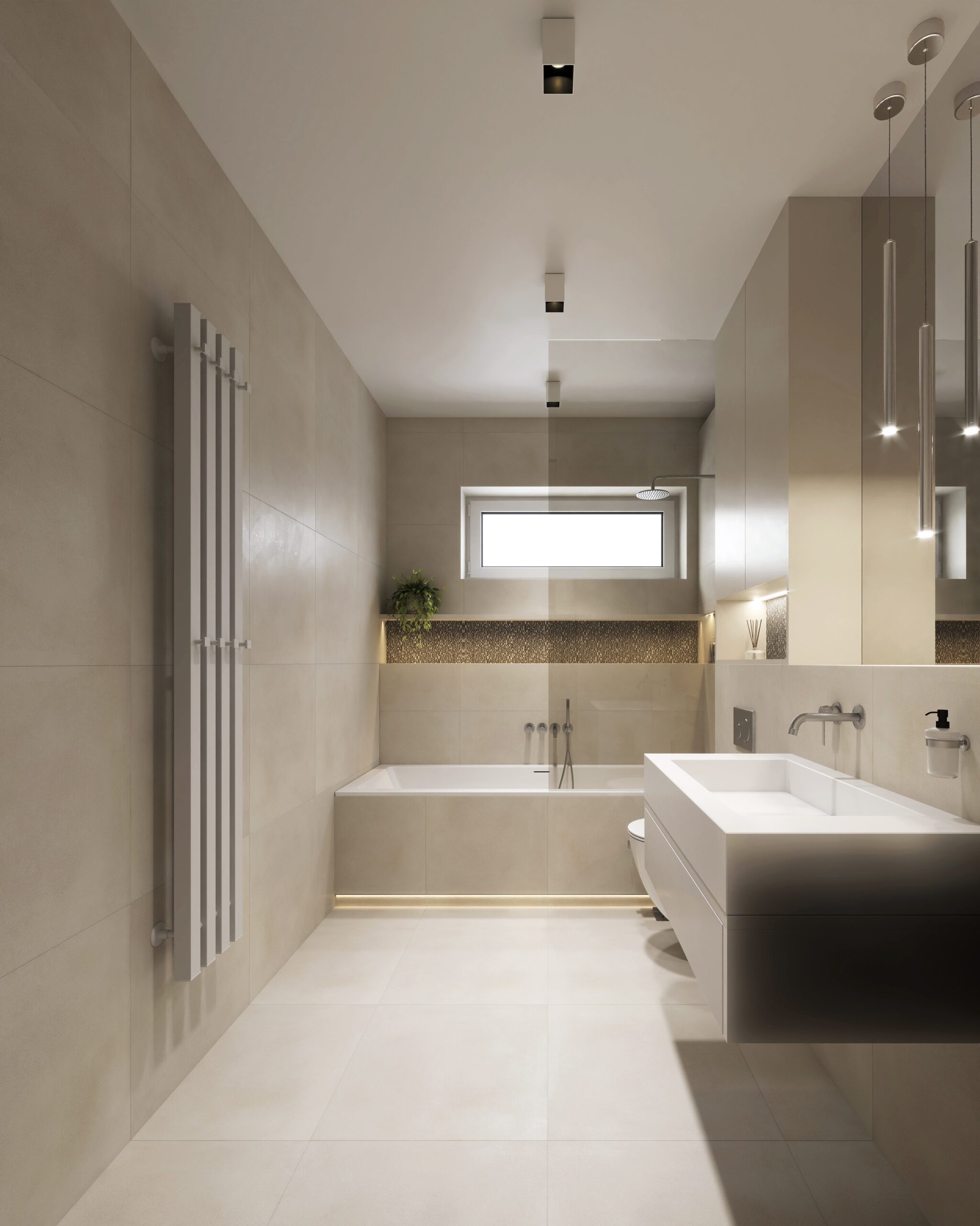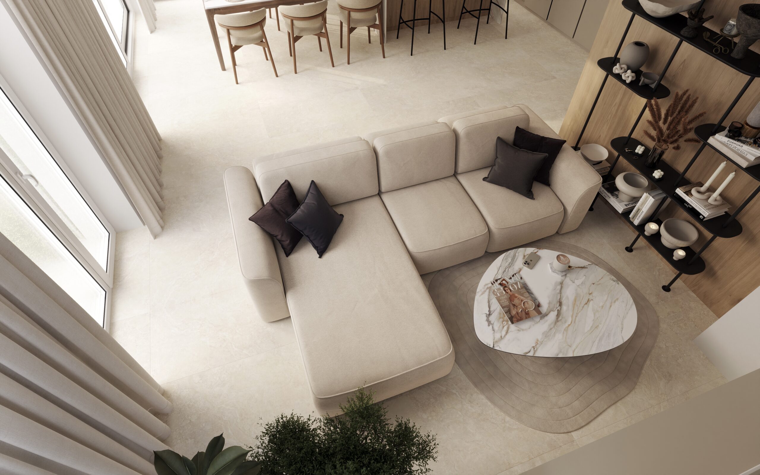 - Salon, kuchnia, korytarz — wielkoformatowe płytki Aeterna Sand Natural 120×120 cm. Subtelny beż dodaje wnętrzu przestrzeni i światł