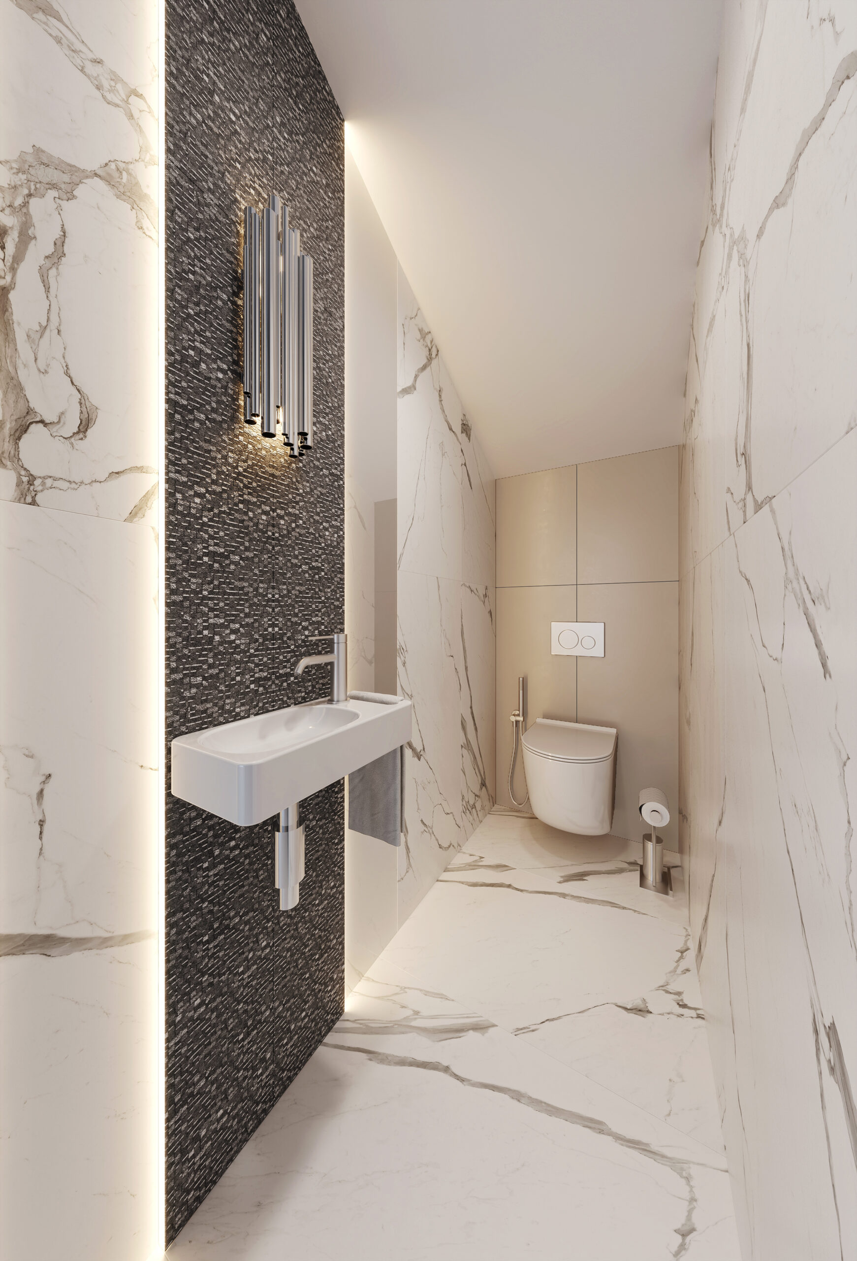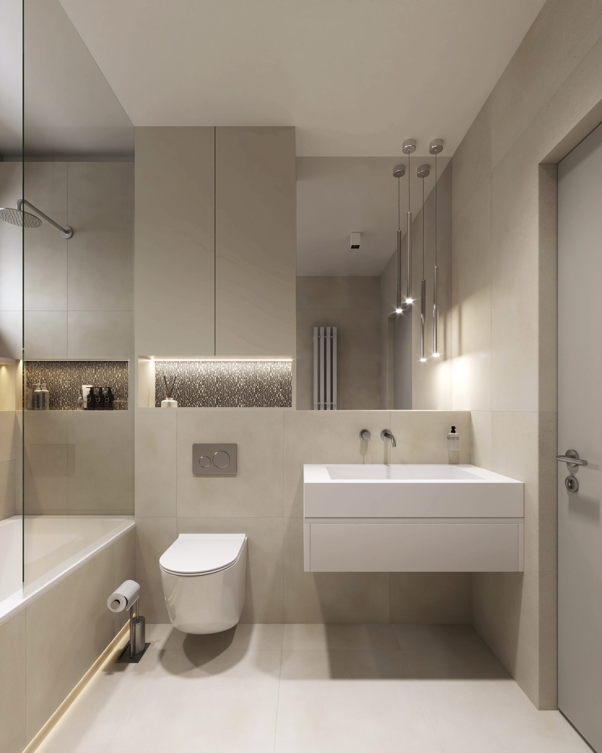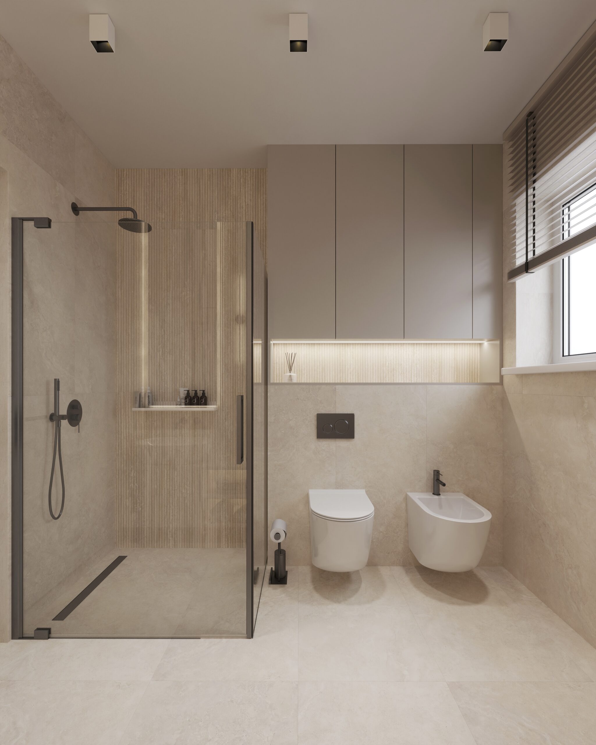 - Wyposażenie Mobi w odcieniach Gunmetal Brushed i Chrome: armatura podtynkowa, umywalki, systemy stelaży — każdy element dopracowany w szczegó