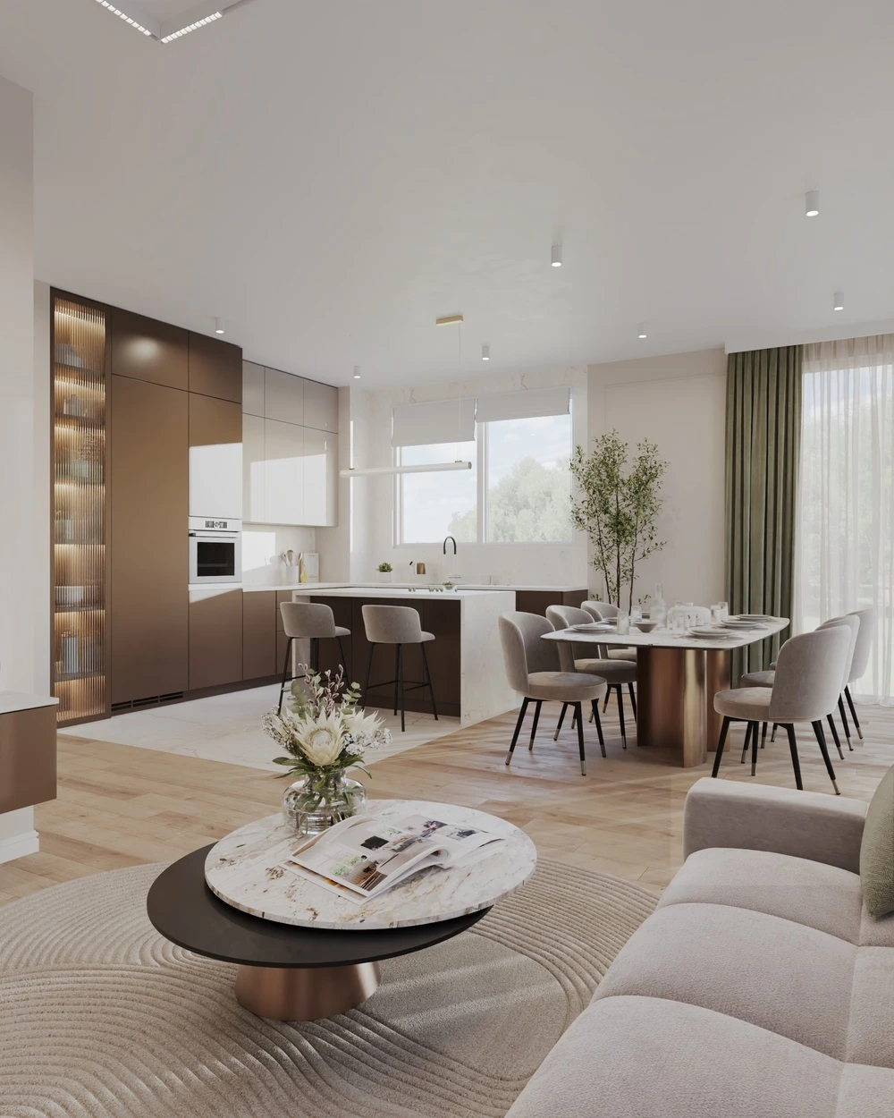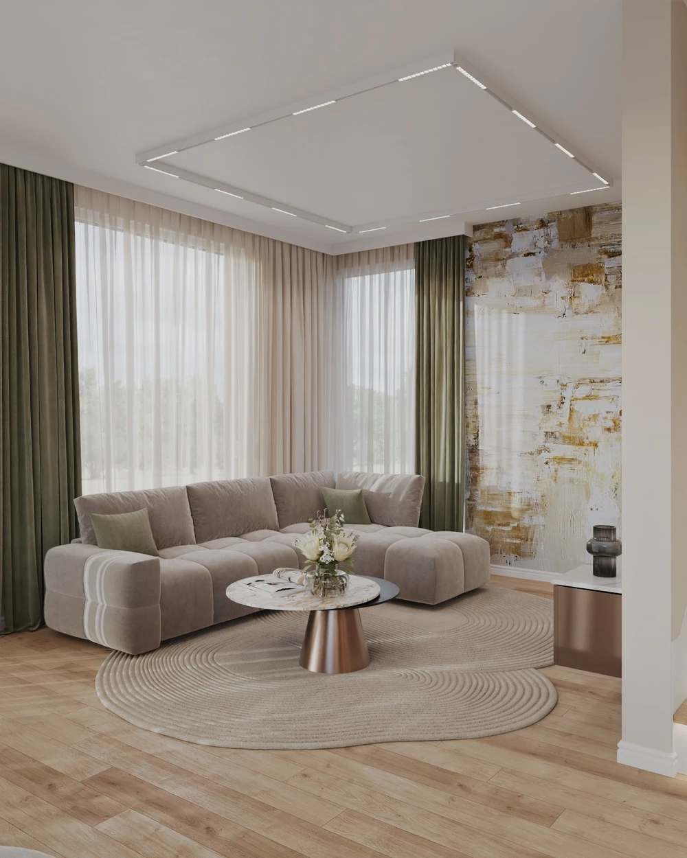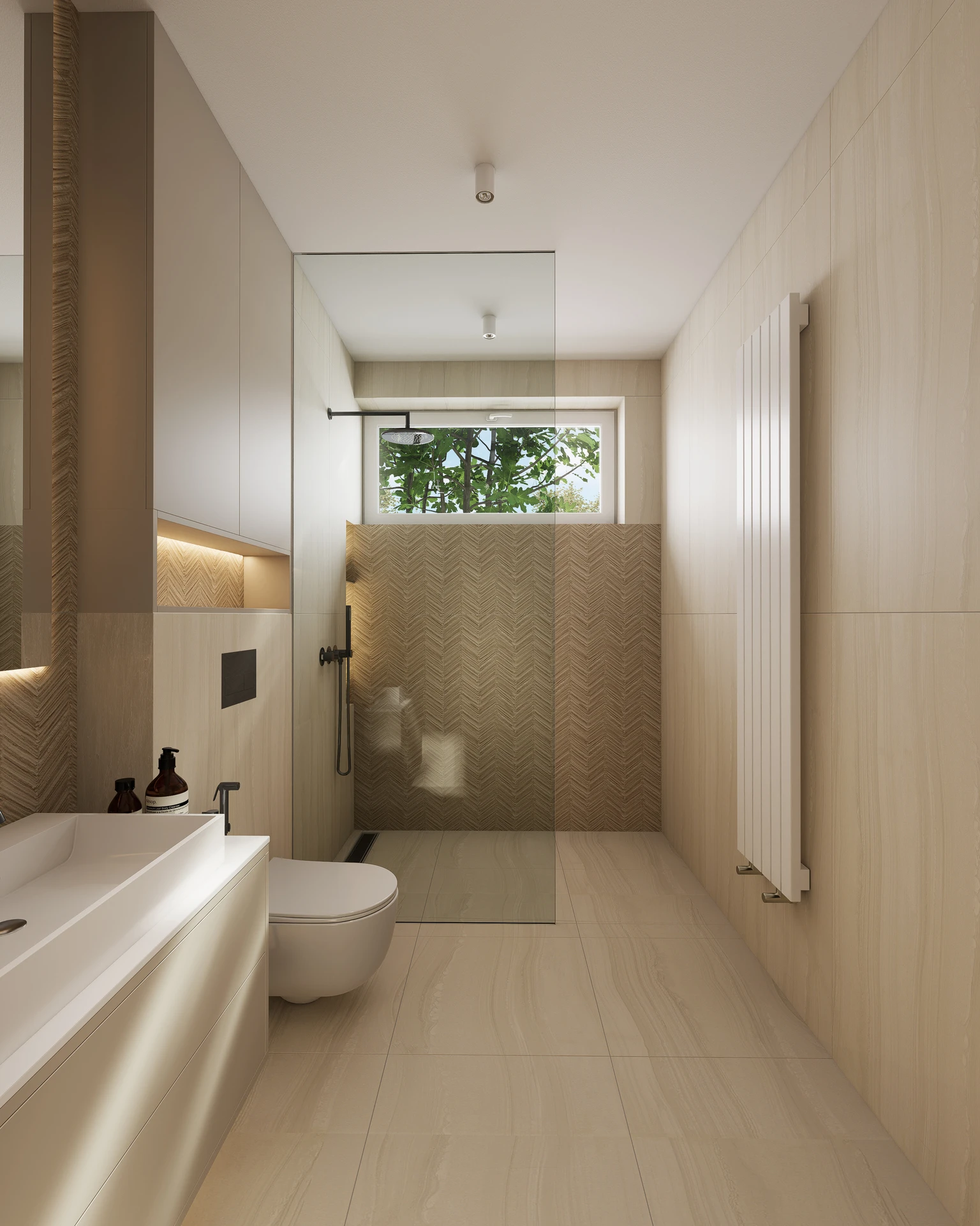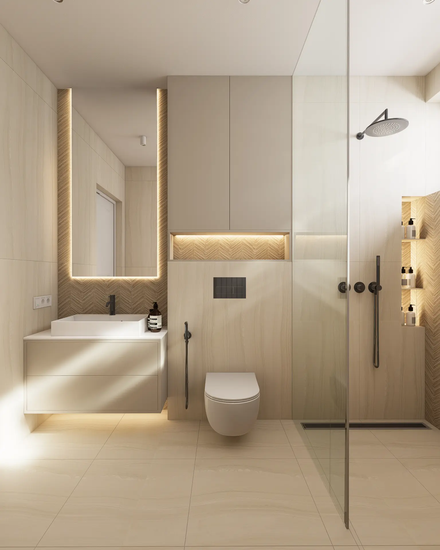 - Dyskretne podświetlenia LED w zabudowach i meblach.