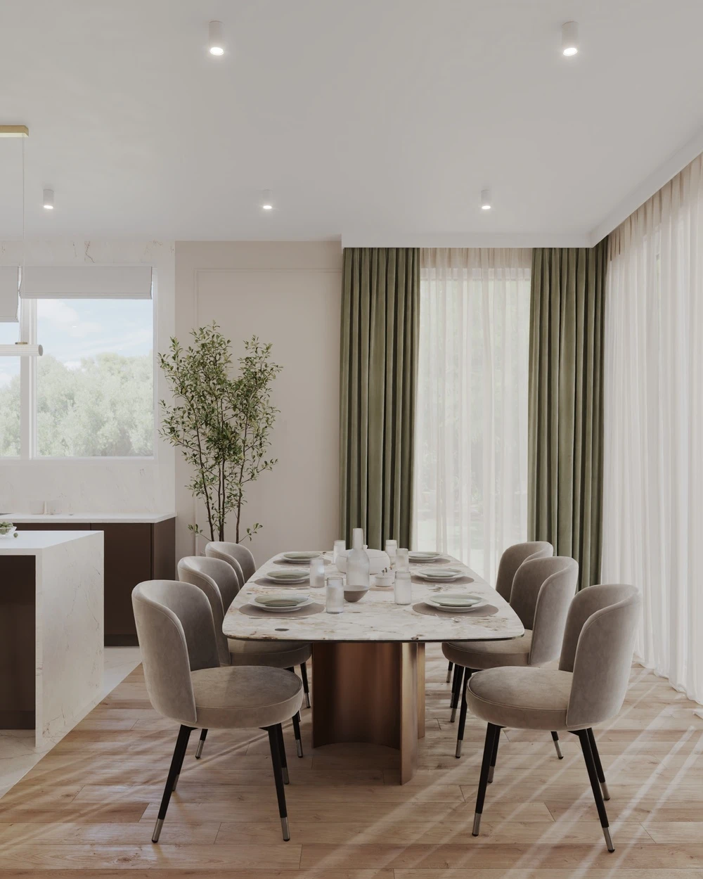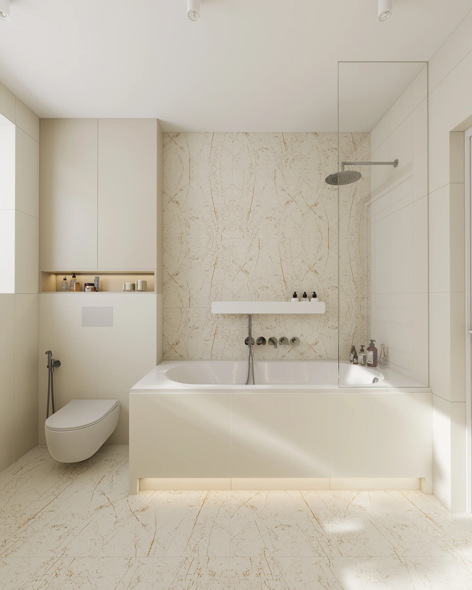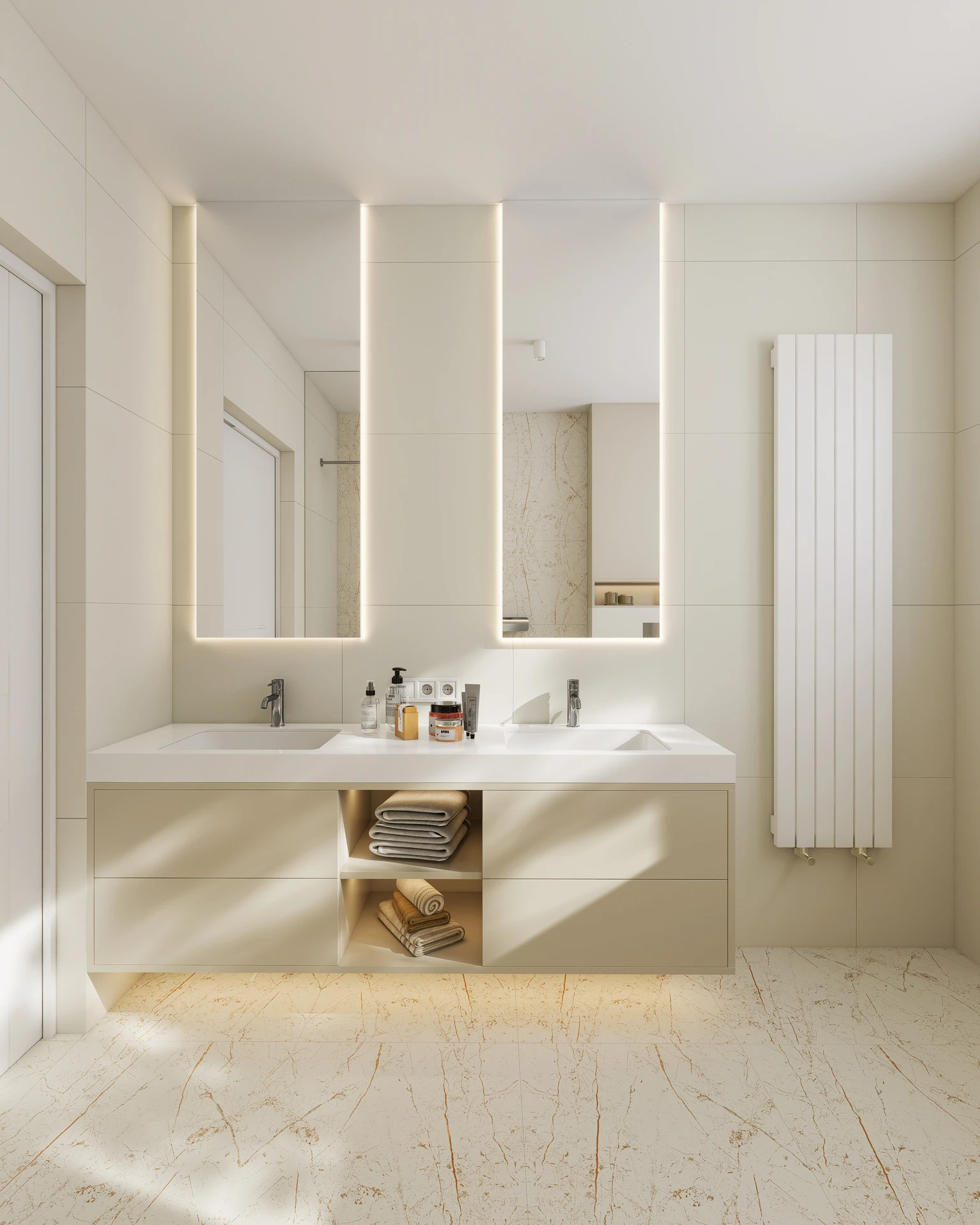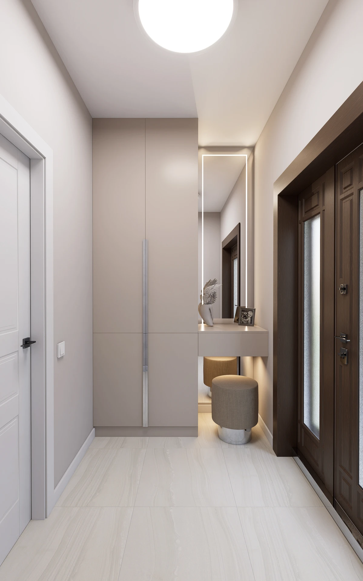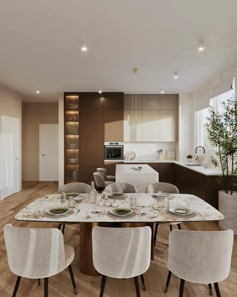 - Dyskretne podświetlenia LED w zabudowach i meblach.