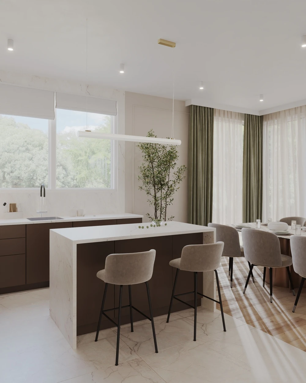 W Domu #2 klasyczny styl podkreślają szlachetne materiały i ponadczasowe formy, a nowoczesne rozwiązania zapewniają wygodę codziennego życia.