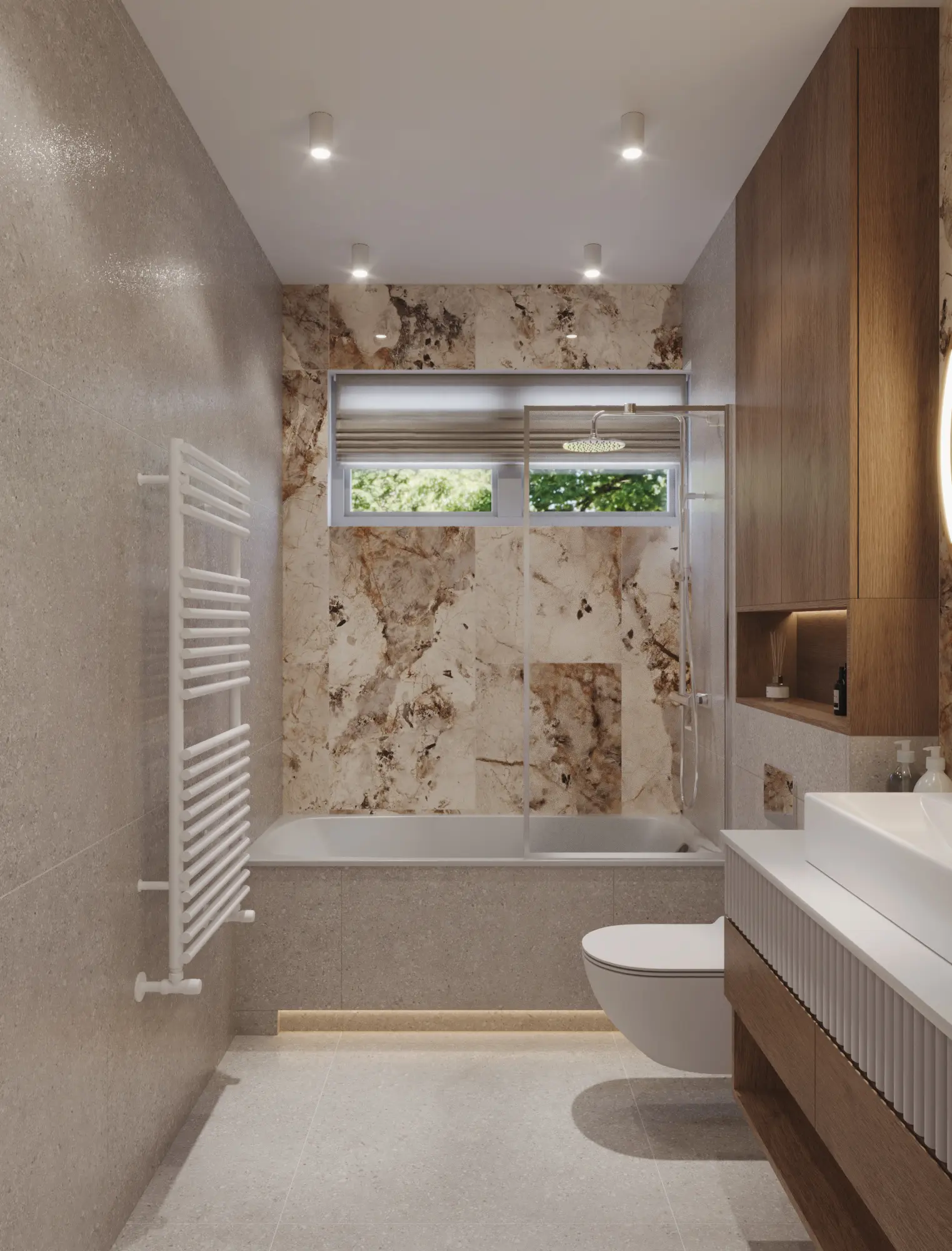 - Płytki — starannie dobrane wykończenia w strefach użytkowych, podkreślające trwałość i styl.